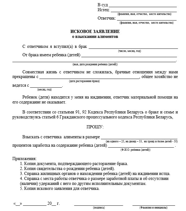 The law governing the payment of alimony in Belarus provides the opportunity to seek payments through the courts, even if they are paid voluntarily. In the absence of such payments, this is the only way to force the parent to support the child. State duty when filing such a claim is not charged.