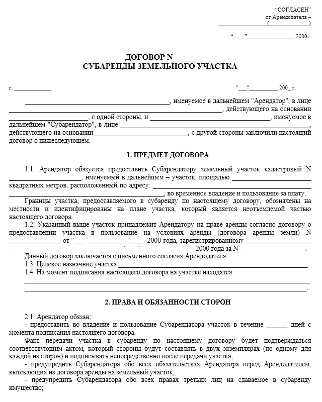 The owner of the territory must be notified that the tenant plans to sublet the land. If the main lease is drawn up for a year, you must first obtain consent from the owner to transfer the land to the tenant.