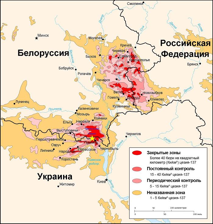 Below is a list of exclusion zones of the Chernobyl nuclear power plant marked on the map.