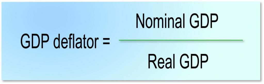 The calculated formula for the deflator when dividing the nominal GDP (Nominal GDP) by the indicator (GDP deflator) and multiplying the result by one hundred shows the indicator of real GDP (Real GDP). This process is called deflation of nominal GDP into real. The GDP deflator is:
