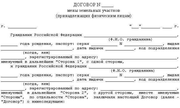 The land exchange agreement refers to the transfer of land to the ownership of one party in exchange for another land. Since barter is a legal relationship on a reimbursable basis, then the general rules governing purchase and sale transactions are used with respect to it, with the specifics that are due to the very nature of this type of transaction.