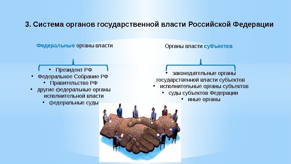 Thus, the federal state bodies of Russia are components of the executive, legislative, and judicial branches. Each of them is endowed with his individual powers and performs the functions prescribed to him by the Constitution.