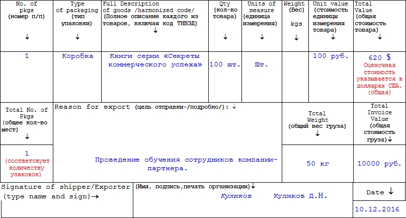 - In the case when you send two or more goods, it will not be superfluous to check the cost breakdown for each of the varieties of products. In this case, the total declared value for the entire shipment must also be indicated. If it is not, then ask the person in charge to calculate this value and enter it in the document.