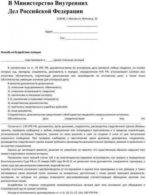 When complaining to a court, one must take into account the norms of the Code of Criminal Procedure, Code of Administrative Offenses. How is a complaint about police inaction written here? A sample is selected based on a specific situation.