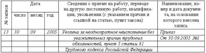 - Make an entry in the employee’s work book. In our case, this is clause 6 of article 81 of the Labor Code of the Russian Federation.
