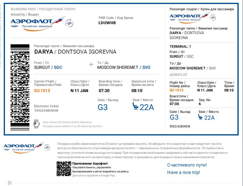 So, we have analyzed an example of a boarding pass for flight SU 1513, Surgut - Moscow. Now you can definitely read your ticket without any problems.