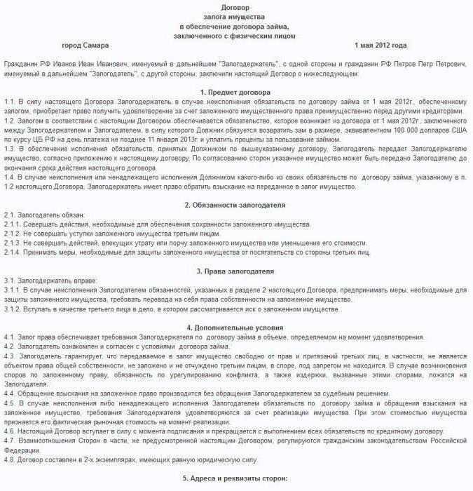 The form of the document can have 5 or 15 sections, it all depends on how the parties were able to agree among themselves.A sample of a property pledge agreement can always be found ready, although it is not recommended to blindly fill out the form with your details and sign, it is necessary to say and register all the agreements reached. Everything should be fixed on paper, and then the possible risks will be minimized.