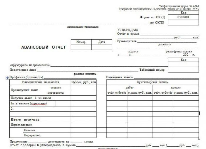 For the report there is an approved standard form No. AO-1. The document belongs to the primary group. An accountable person is involved in filling out the form, that is, the person who received the money to complete the task. The task of accounting is to check the expense report, reflect the entries in the accounting. The form contains two parts: the base, which remains in storage, and the receipt, transmitted to the employee.