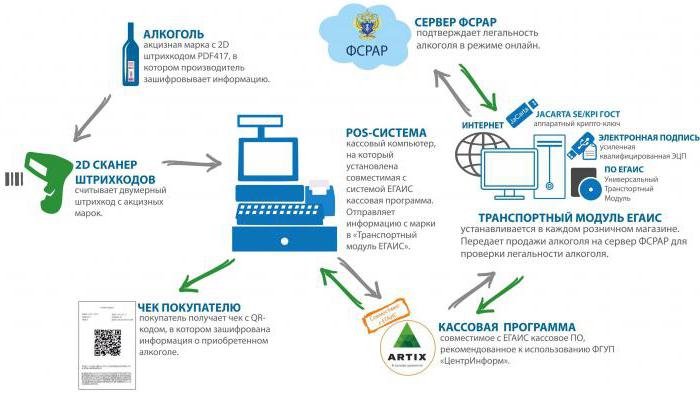 The buyer selects the desired product and is ready to pay its cost. After that, the cashier completely reads the information in the barcode using a 2D scanner, and the goods are beaten off in the check. At the same time, the cash register program generates an XML file, which is sent to the Universal Transport Module. This is a special application that exchanges information with the Rosalkogolregulirovanie server. It is there that a receipt will be created in which a barcode and digital signature of the store are present, a confirmation is sent to the cashier, after which the check can be closed. Thus, the implementation of each individual box or bottle of alcoholic beverages will be marked online through EGAIS. Alcohol is controlled by the state through this system, starting in 2016.