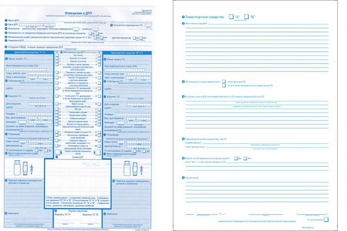 Information about how to fill out a traffic accident notice, available both in the document itself and in any section of the traffic police, as well as on many sites on the Internet. It consists of two pages. The front part must be filled directly at the scene of the accident. It should be signed by both participants in a traffic accident, which will testify to their agreement about what happened. The reverse side may be completed later, when the participant in the incident will have time, but before the deadline for the transfer of all documents to subsequent instances.