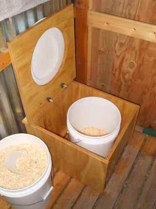 There is another option for the quick installation of a dry closet: put on a toilet seat on a large bucket where a garbage bag is inserted, fixed with adhesive tape to the toilet seat. After each filling, the bag is filled with cat litter, after which everything is poured into a compost pit.