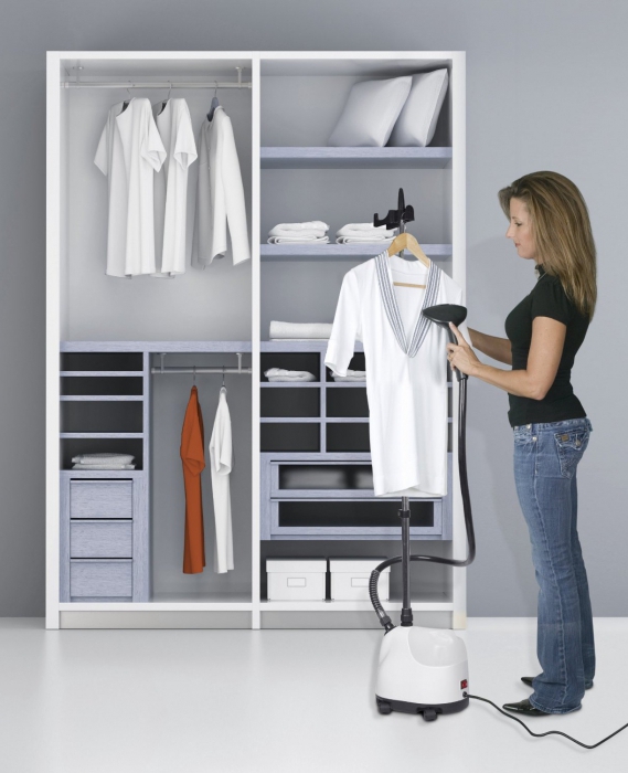 It is quite convenient to keep the steamer in assembled form, so that at the right time it can be simply plugged into the network and get started. And if you intend to store it outside the door, in a narrow hallway or tight closet, then you need to pay attention to appliances with a narrow case, the height of which does not matter. Hand or travel steamers are the smallest of them all, their compact dimensions make it easy to fit them in your bag. With their help, the rumpled suit or evening dress will again receive a presentable look.