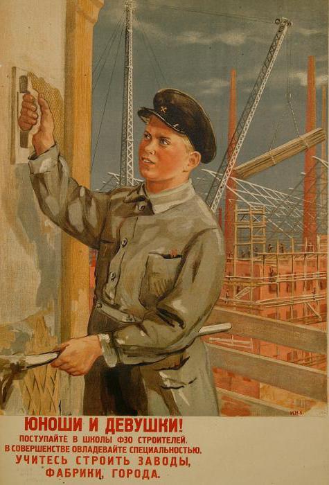 So what is a school of FZO? Deciphering the abbreviation means the lowest type of vocational education institutions that were created in 1940 in the state reserve system. They were organized on the basis of enterprises of various industries or facilities under construction, so most of the time was devoted to production training.