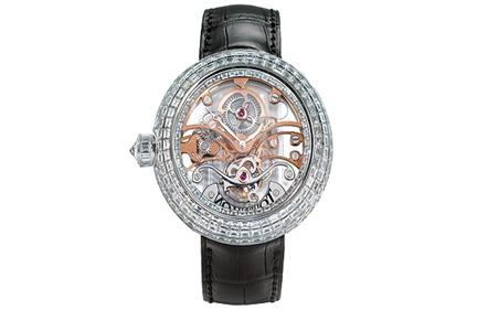 Jacob & Co. - Crystal Tourbillon. Opens the top ten masterpiece from the famous company, which was released in just 18 copies. Made of pure gold 18 carats, decorated with 17.48 carat diamonds. The original mechanism and design are the features that can characterize this chronometer. A crocodile leather strap will never let you down.