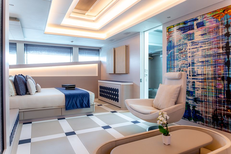 The yacht is designed for 10 people. On board there are five luxurious bedrooms and as many bathrooms.