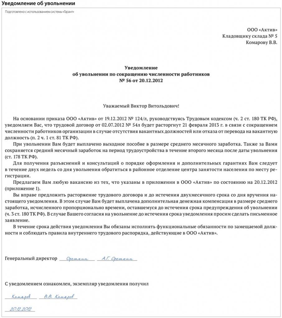 - the method is most often used in which the head of the enterprise gives notifications to each redundant employee personally in his hands, after which the citizens must sign on another copy of the document;