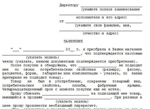 A sample application for a return of goods of inadequate quality can either be downloaded on the Internet, as they all have a typical structure, or you can compose yourself, the main thing is to specify the information that is needed.