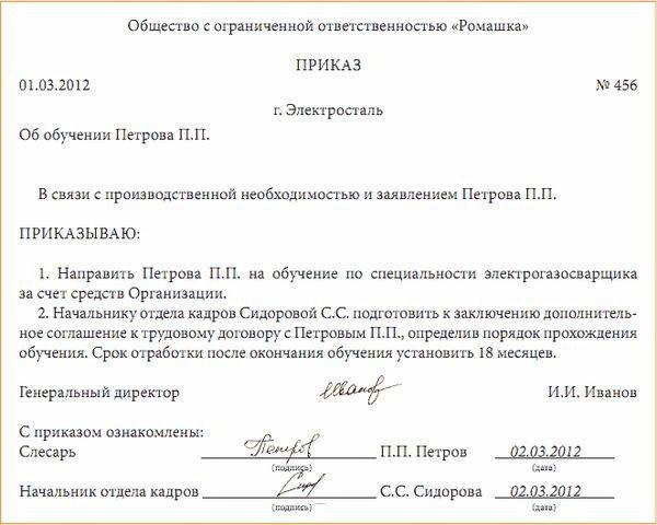 You need to start in the same way with the preparation of an annual plan. A separate management order is issued for each employee with an indication of the form of training (evening, correspondence, and so on). An agreement with an educational institution must be concluded on behalf of the company. It is necessary to request the program of the institution and a copy of the license for the application to the contract.