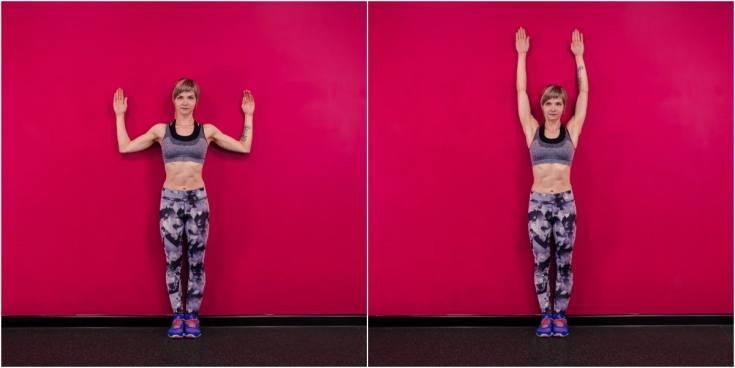 - Raise your arms above your head so that the back of your arms touch the wall. Bend your elbows at an angle of 90 degrees to keep your arms straight.