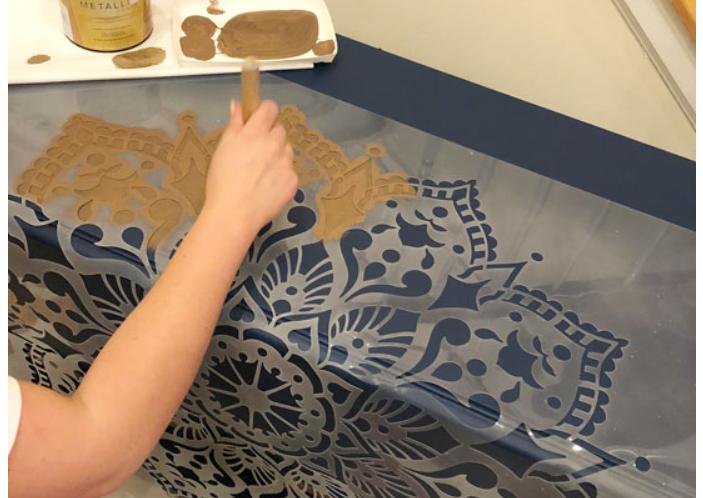 After that I put a stencil with a mandala on the table and, dipping my brush in metallic paint, began to apply the drawing.