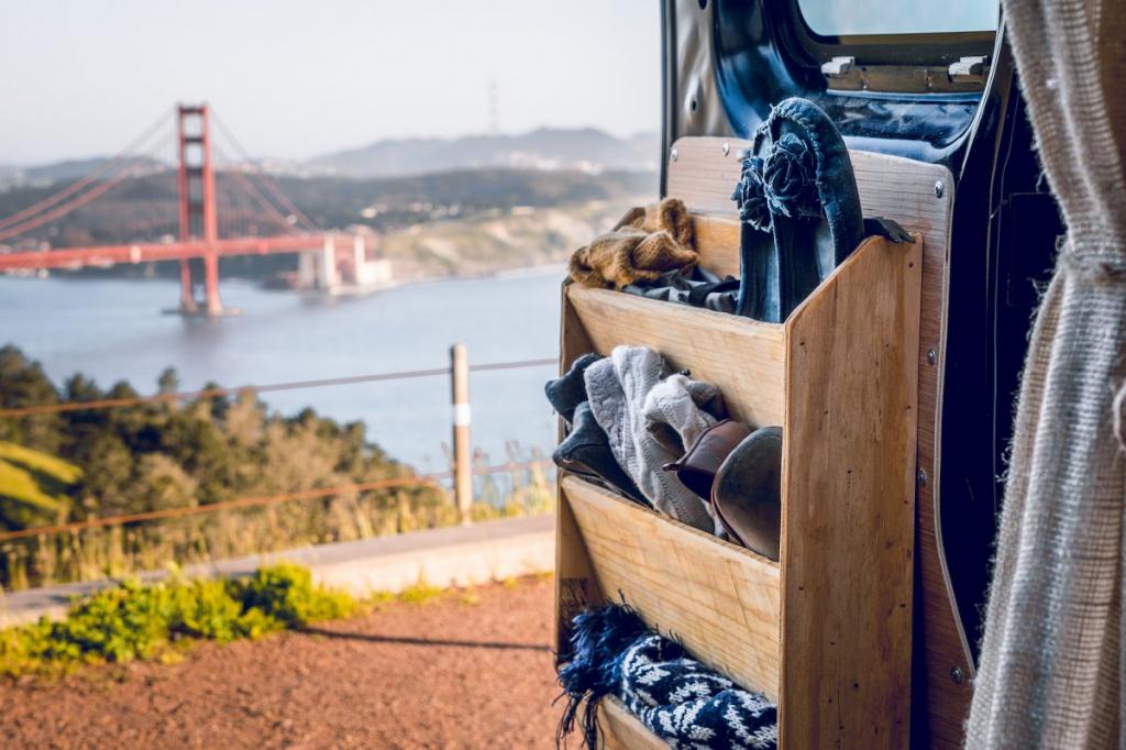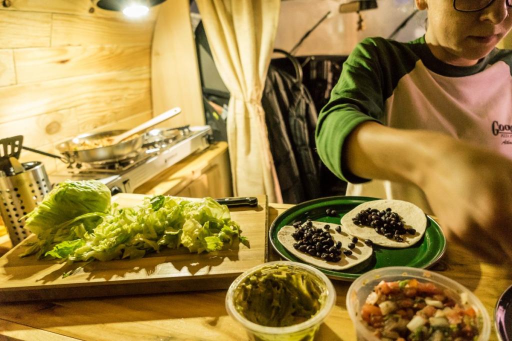 The van has a small kitchen where you can prepare simple dishes. The kitchen turned out a little more than a bedroom. The refrigerator is a special bag for carrying food. Lunch in a cafe is very expensive, so the couple purchases products in different supermarkets. The van has an integrated water supply system.