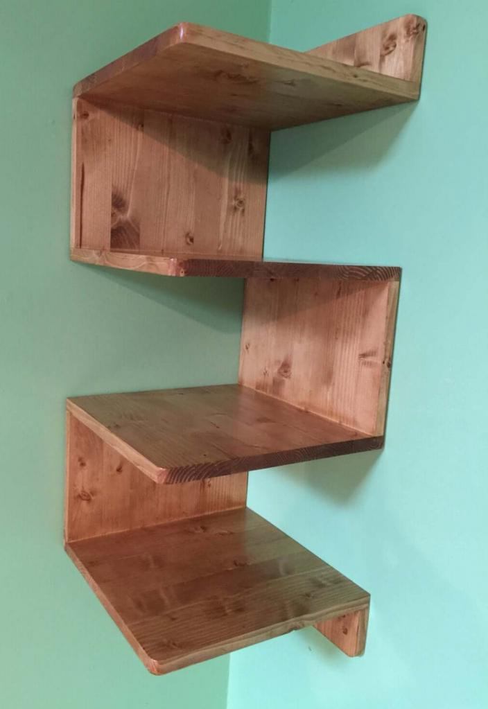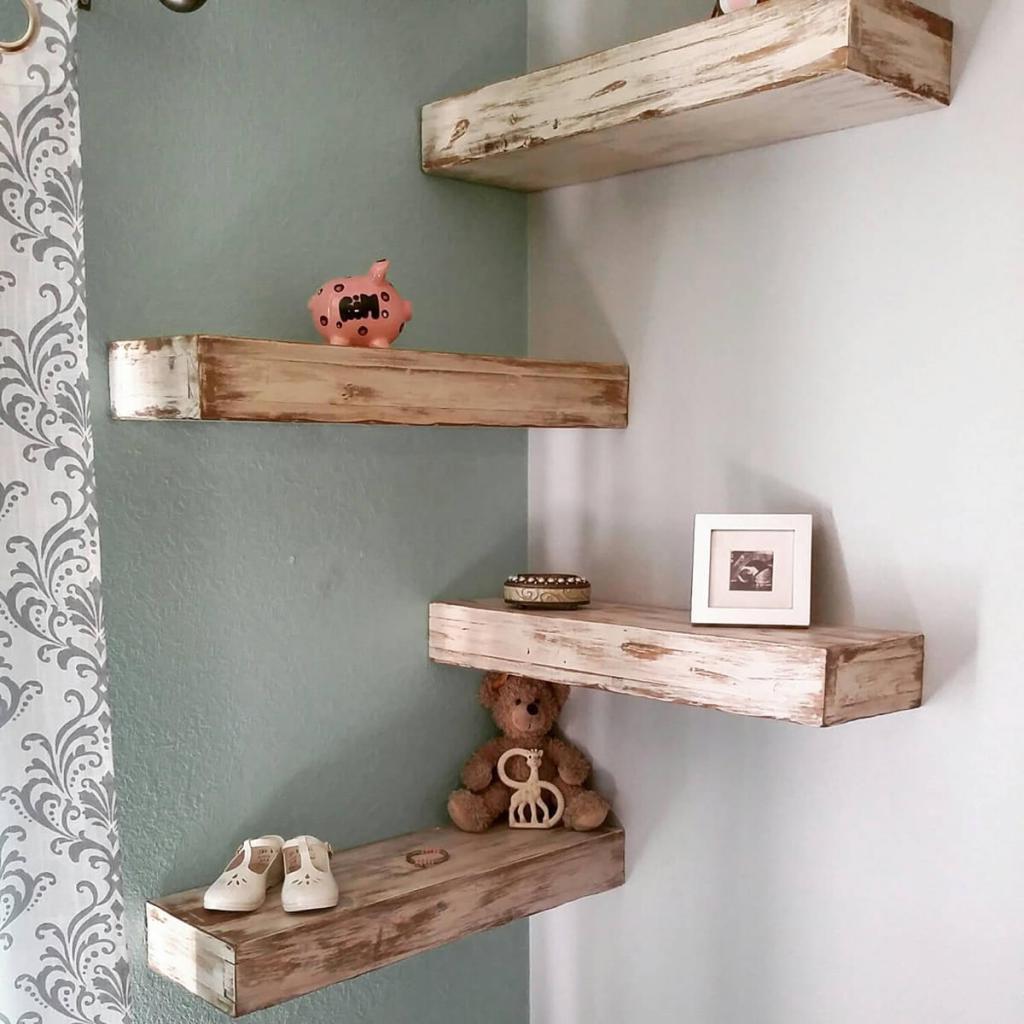 This do-it-yourself corner shelf is full of rustic charm. It can be made of any size and height. It all depends on what items you want to place on it. You can paint these shelves in any color, but a simple tree looks very good.