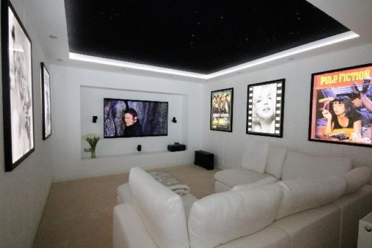 - personal cinema with a 75-inch screen, soft white fabric walls, a modern Bose sound system and a starry sky ceiling.