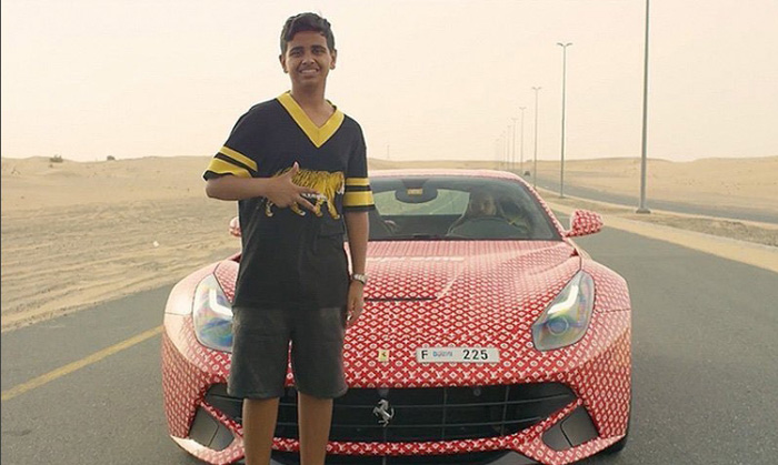 The billionaire's teenage son Rashid Belhasa shows off a £ 200,000 Ferrari. However, since the legal age for driving in Dubai requires eighteen years, he will have to wait another year before he can drive it. Rashid, among other things, has a Bentley, Rolls Royce, Lamborghini.