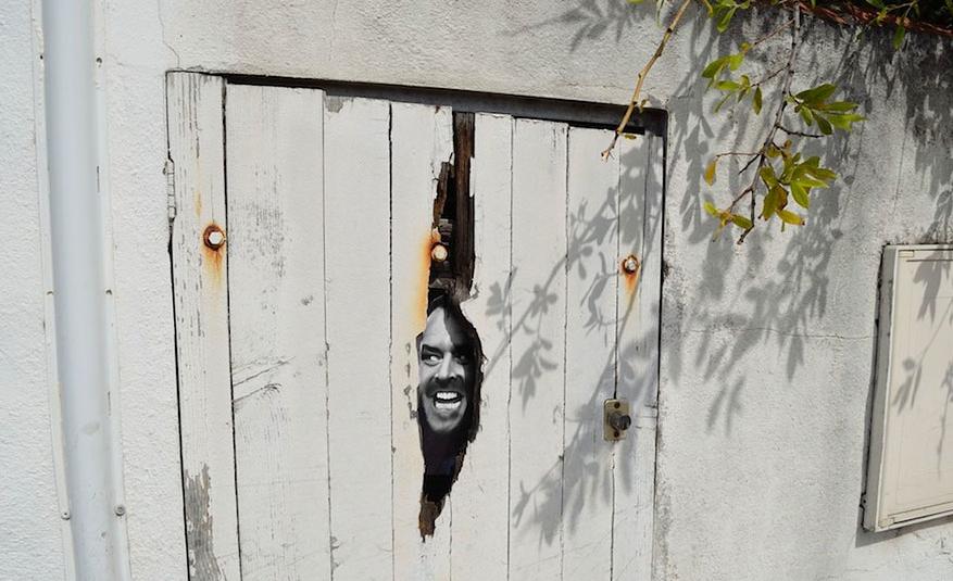 Someone painted the face of a maniac man in the place of a fallen piece of wood on a shabby plank door. As if he is behind this door and looks fiercely through the gap.
