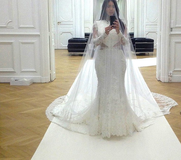 During her wedding ceremony, the reality star changed four outfits. However, the main one was a Givenchy dress with lace accents and a long train, created for Kim by the creative director of the house of Riccardo Tishi.