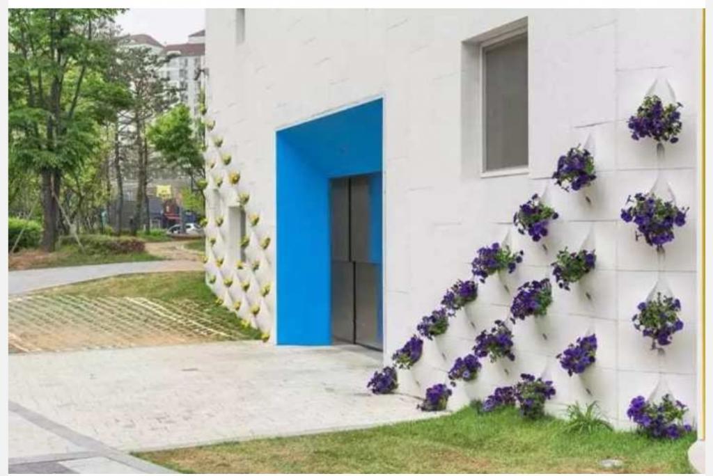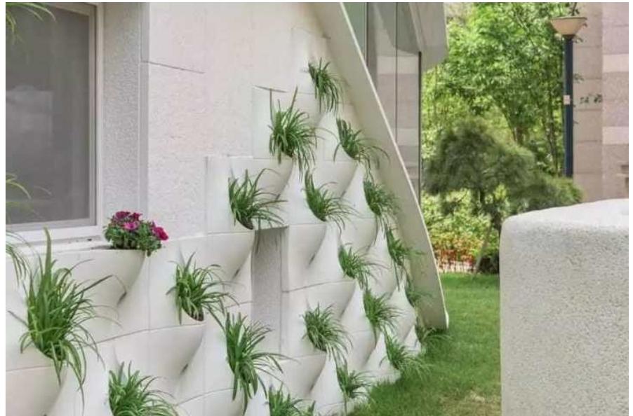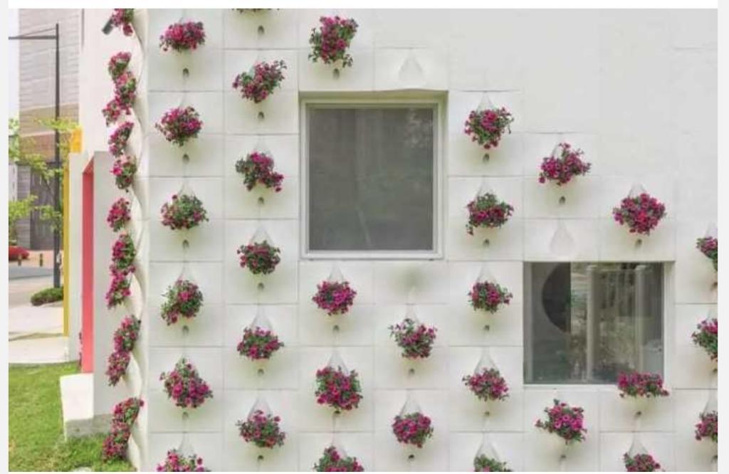 In fact, the author applied the quite common concept of vertical beds, which are formed from pockets for planting plants. Another thing is that in the traditional form, such beds are made out on special cloths from fabric and decorate the walls in the garden as a complete decorative solution. In this case, the author combined the facade with the decorative function of a vertical bed.