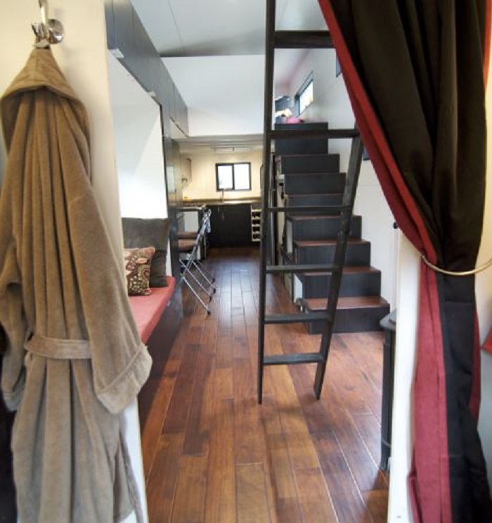 The tiny dwelling has everything that is available in an ordinary apartment, including a shower and toilet. The bathroom is very comfortable and allows you to wash with convenience. The spouses seem to have enough space in this tiny house.