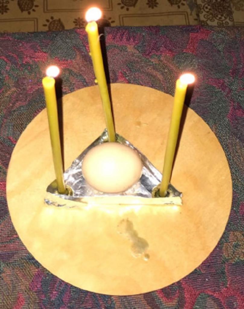 Having placed the coins in the corners of the plate with the eagle down, a friend put candles on them, and placed the egg in the center of the dishes.