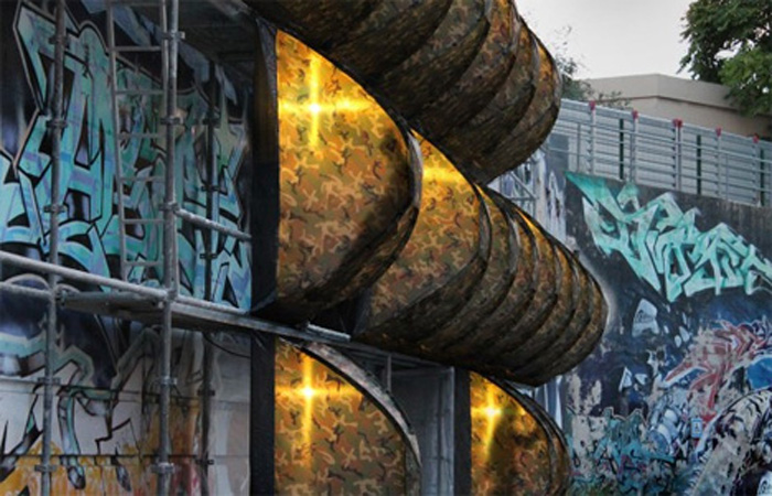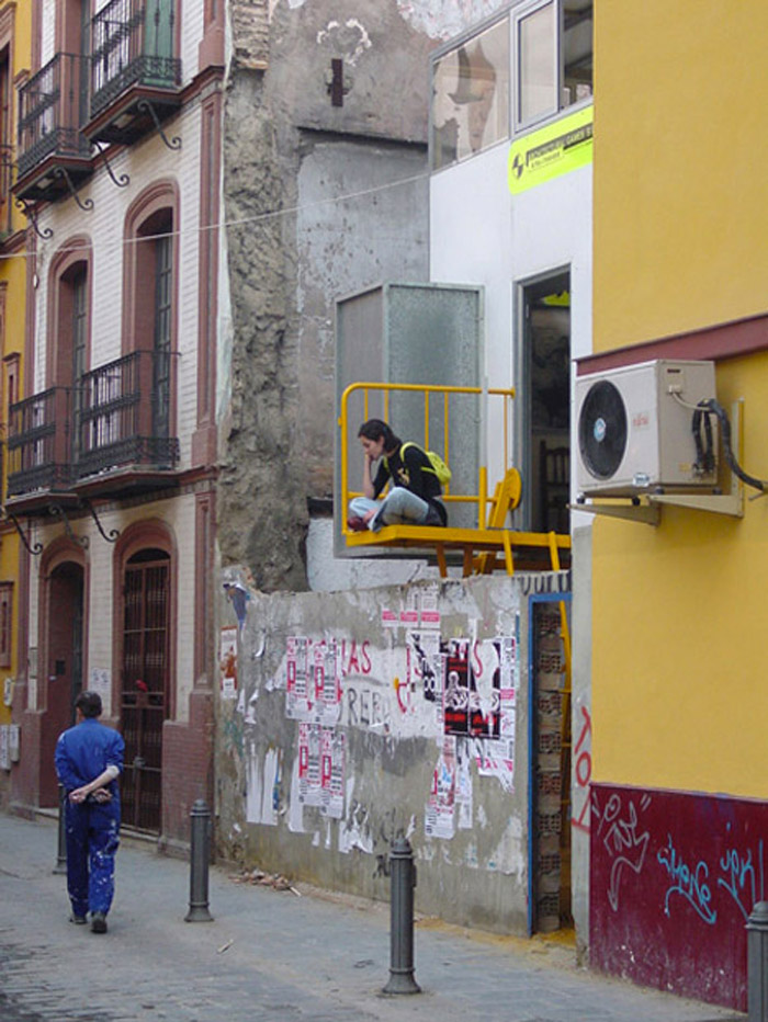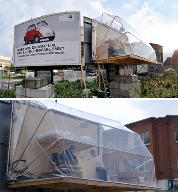 Belgian artist and activist Karl Philips focuses on topics such as gaps in legal, economic, and social systems, ubiquitous advertising, rampant capitalism, and consumer protection. Therefore, it is not surprising that he decided to turn a billboard into an illegal apartment. The apartment is invisible from the street, consists of a simple wooden platform and a transparent plastic case. A similar project appeared in Mexico City: they built a house (50 square meters) at the back of the billboard as a residence for artists who manually painted the billboard for the paper company Scribe.
