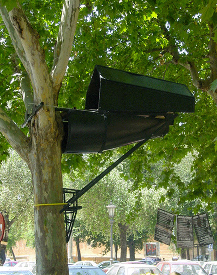 The Spanish design team, Recetas Urbanas, has created a series of structures that use loopholes and ambiguities in the Seville Housing Code to create free and affordable self-catering housing. One example is this curious looking sleeping container, a partisan home that clings to a tree.