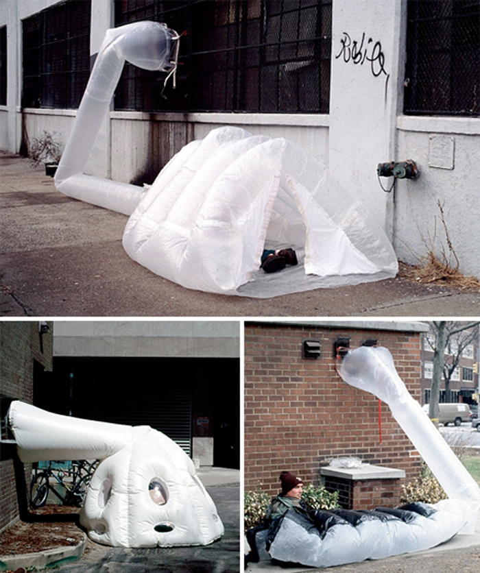 Attach a custom-made plastic shelter to the ventilation hole in the building, and you get instant inflatable shelter for the homeless. Michael Rakovits creates these “paraSITE shelters," which, by their size, are in line with the legal definitions of temporary structures, at costs less than five dollars.