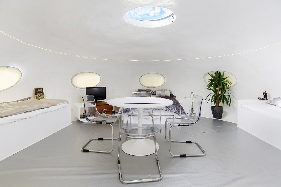 The futuristic hotel can accommodate up to 4 guests. The aluminum capsule is located in a remote corner of Scotland, in the town of Redbert. The hatch in the UFO Futuro opens by remote control, and using the wide portholes at night it is convenient to view the starry sky.