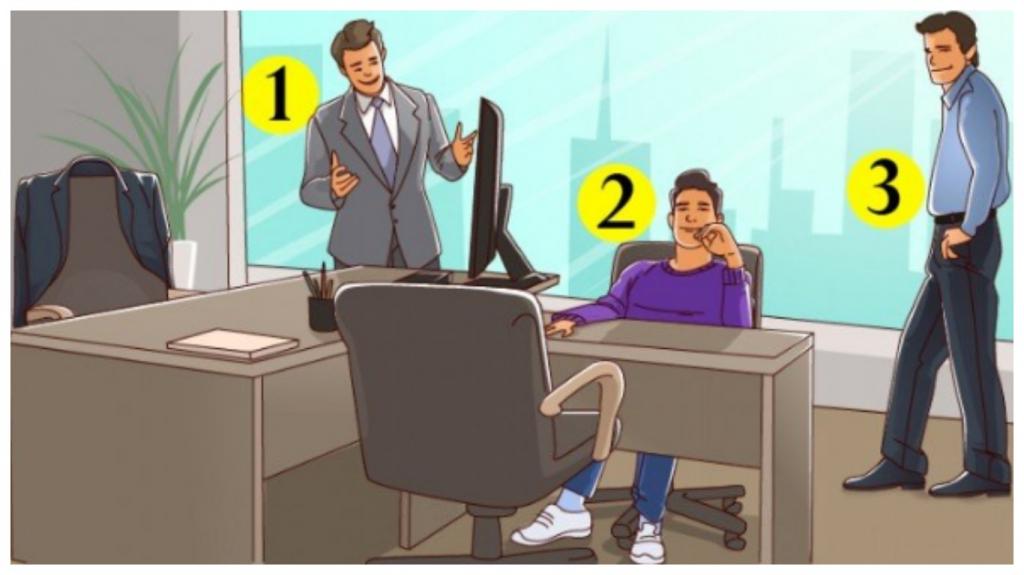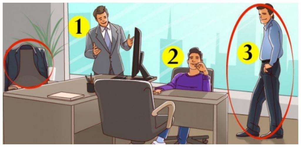 The person at number 3 is also not the boss, because he follows the dress code and is pretty tense. Also on the chair flaunts a jacket, which clearly belongs to him.