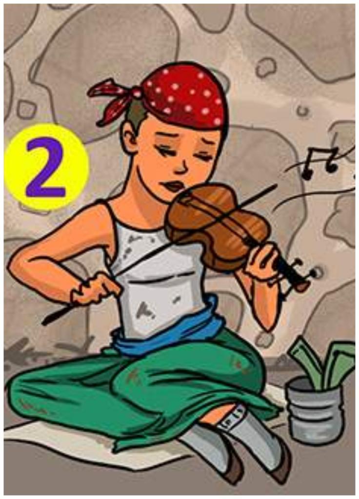 One beggar is trying to sell flowers, the second is playing a musical instrument. The third, in all likelihood, is trying to earn money to feed his dog.