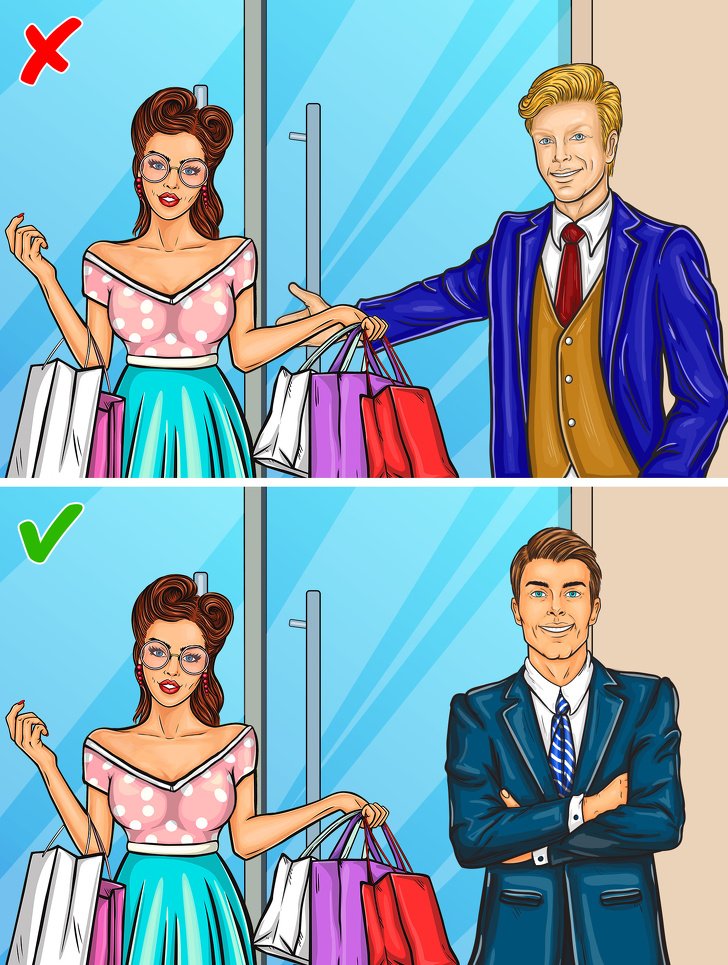 A real gentleman always drives a woman and helps her with heavy bags, but in the workplace do not allow yourself this. Come out and come in first, without opening the door for anyone. The same applies to girls wearing coats. In the workplace, women do not need help or gentlemanly gestures from a man and can even take this as an insult.