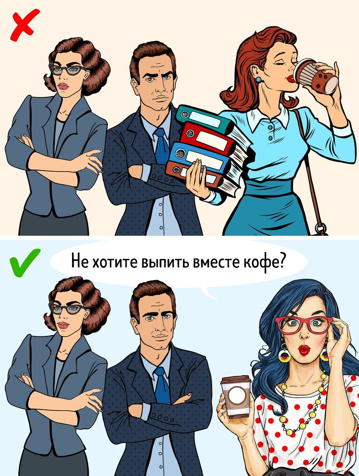 At your workplace, monitor your body language. A conversation with colleagues with arms crossed and half-closed eyes is hardly perceived as a pleasant conversation.