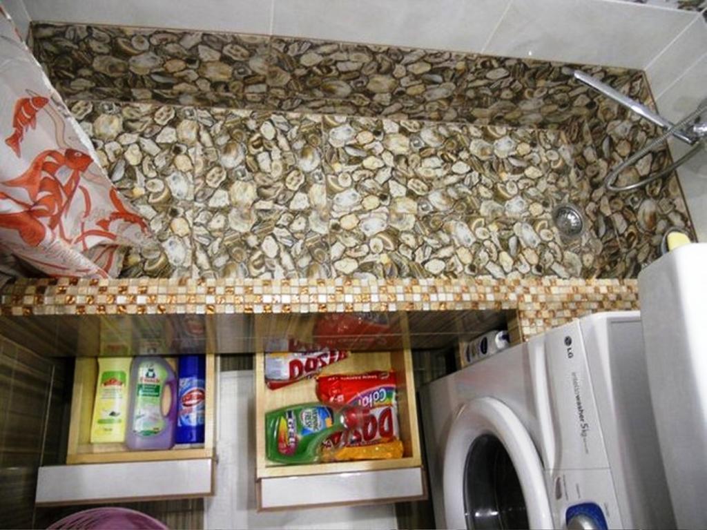 Naturally, in such a miniature room there is no place to store many things, so the washing machine was placed directly under the sink. Also a very advantageous trick was the fact that a small cavity under the bathtub was reserved for boxes for storing detergents.