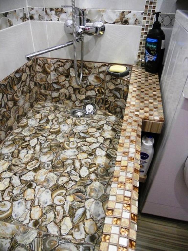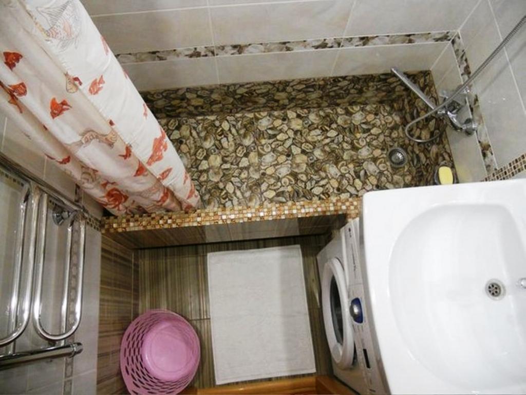 The walls of the old house were built in 1976, they were again leveled somewhere up to 5-6 centimeters. As for the bathroom itself, the couple decided to act sparingly. The design was adjusted to the desired size so that two people or a child could fit in it.