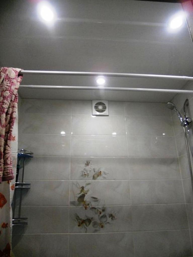 The ceiling made of PVC panels was equipped with three built-in lights and a fan. Now the room looks much more spacious.