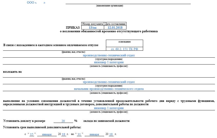 - an order to replace an employee for the period of vacation, in which the employee selected for replacement is prescribed, as well as the duration of this process;