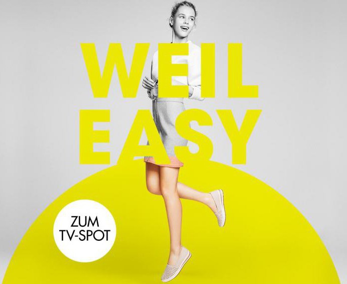 Alternatively, many photographers try to obscure or introduce a human figure into the shadows. In contrast to such a fuzzy picture, they exhibit shoes that are highlighted in bright colors. In some cases, the emphasis is shifted due to the overlap of the upper body of the model and the allocation of the lower. For example, in an advertisement for TM Marco Tozzi shoes, the upper part of the photo, where the head, legs and torso of the model is located, is highlighted in gray.