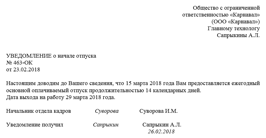 It should be understood that there is no single form for notification of vacation to the employee. Each company can make a sample taking into account the particularities of the enterprise.