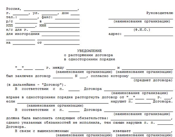 When a party to the agreement sends a notice of termination of the contract unilaterally, the other party may put forward material requirements. In order to avoid the settlement of controversial issues in court, it is necessary in writing and to detail the procedure itself.