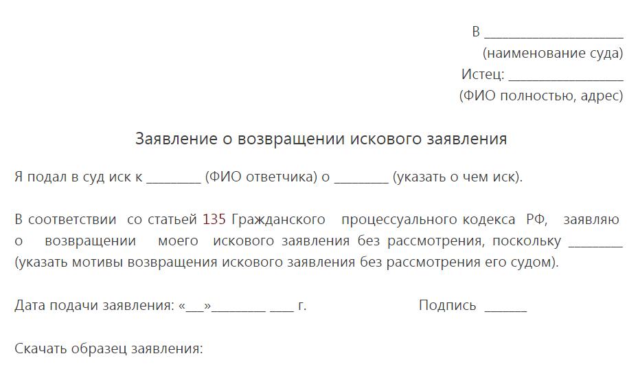 The decision is made by the judge who received the application. After checking it for compliance with the norms of the law, he makes a determination. And the document, referring to the Code of Civil Procedure, explains the reasons for the return of the statement. It is explained: what is the violation of the rules of jurisdiction, pre-trial procedure for resolving disputes and how the circumstances that prevent new treatment are eliminated. Does the plaintiff have the right to request the return of the statement of claim in a civil proceeding? A sample of such a statement is in our review (see above). At the same time, we note that some violations or circumstances identified after the opening of the proceedings are subject to other provisions of the Code of Civil Procedure, in particular, being left without consideration or withholding a claim.