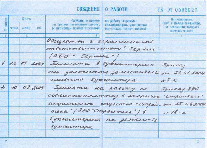 In order not to make mistakes in entering the information, the following is an entry in the part-time work book (a sample of filling out a document with additional work in a third-party organization).